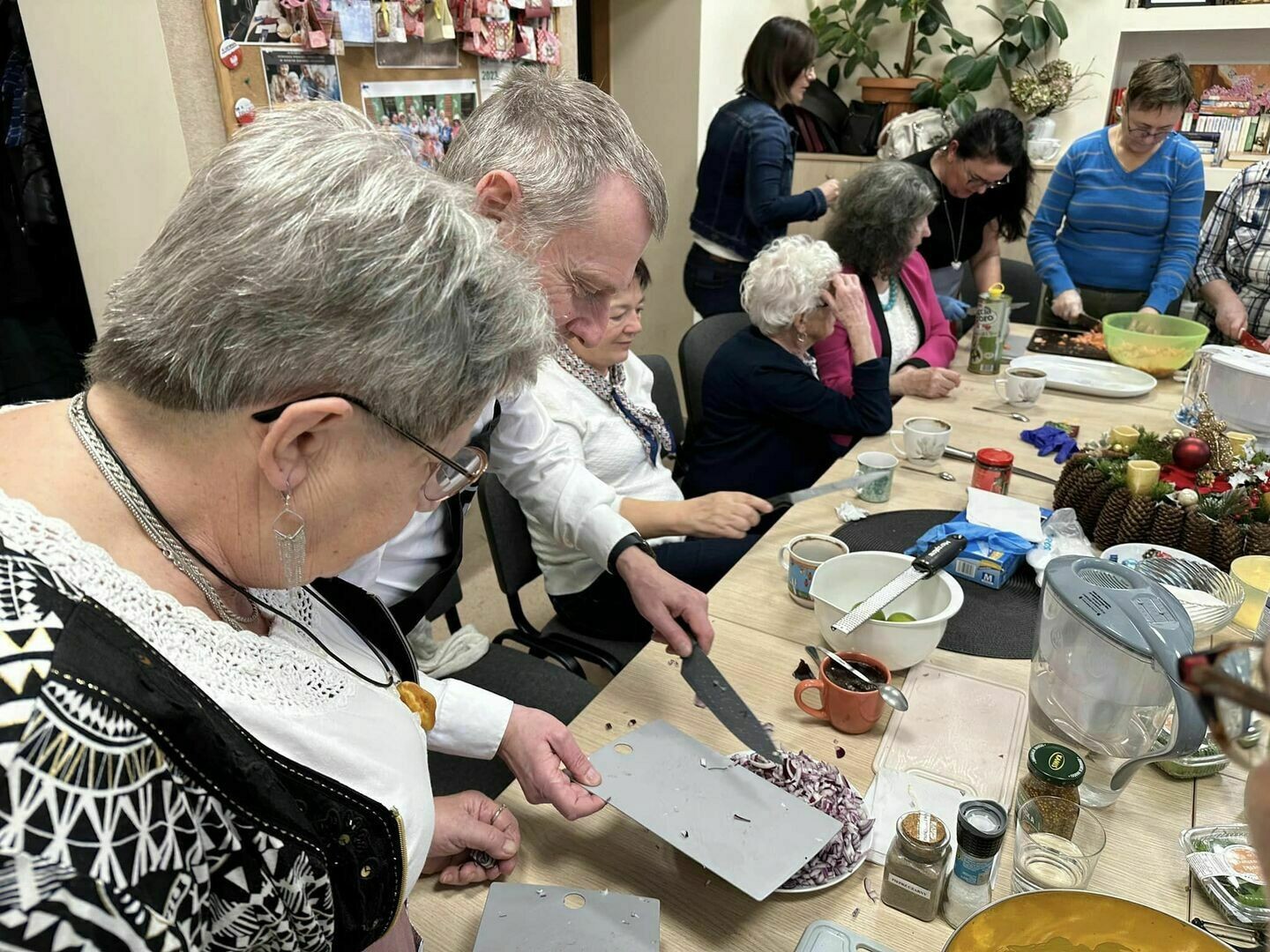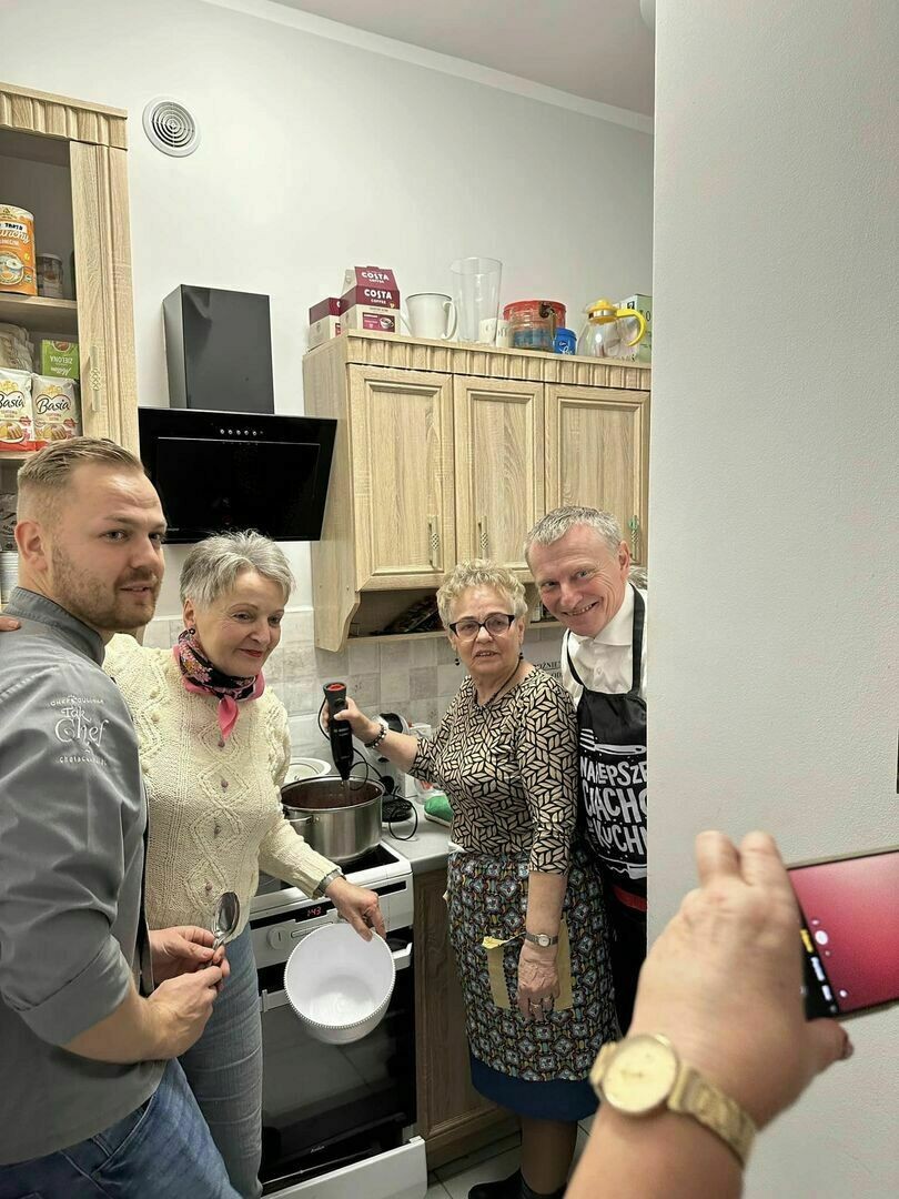 Gotowanie w Klubie Seniora Świąteczne gotowanie w Żuławskim Klubie Seniora Razem z Seniorami pyszne potrawy przygotowywali Burmistrz Jacek Michalski i Zastępca Burmistrza Rafał Kubacki. fot. Gmina Nowy Dwór Gd