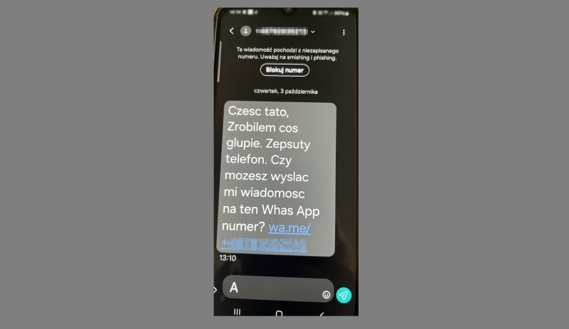 Policjanci uzyskali informację, że mieszkaniec naszego powiatu otrzymał wiadomość na jednym z komunikatorów o treści „Cześć tato, zrobiłem coś głupiego. Zepsuty telefon. Czy możesz wysłać mi wiadomość na ....". Na szczęście zgłaszający był czujny i nie dał się oszukać. Nie odpowiedział na wiadomość i nie kliknął w link. Natychmiast powiadomił służby i zgłosił zaistniałą sytuację. Policjanci apelują o ostrożność.