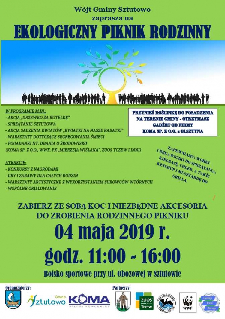 Zaproszenie na Ekologiczny Piknik Rodzinny, który odbędzie się 4. maja br. w godz. 11:00-16:00 na boisku sportowym w Sztutowie.