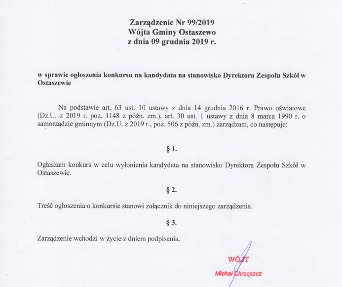 Zarządzenie nr 99/2019 Wójta Gminy Ostaszewo z dnia 9 grudnia 2019 r. w sprawie ogłoszenia konkursu na kandydata na stanowisko Dyrektora Zespołu Szkół w Ostaszewie.