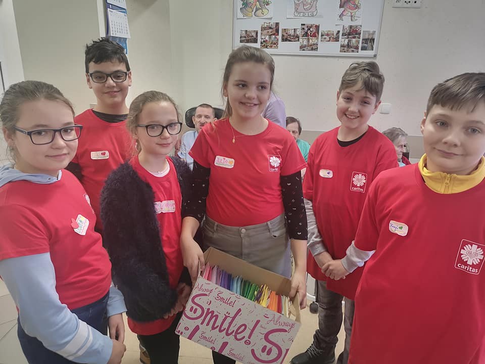 Z tej okazji Podopiecznych Zakładu Opiekuńczo- Leczniczego odwiedziła dziś młodzież ze Szkoły Podstawowej w Nowym Dworze Gdańskim wraz z nauczycielką Panią Joanną Burczy. Uczniowie przynieśli ze sobą wiele radości. Przygotowali piękne laurki i kwiaty dla wszystkich pacjentów jak i pracowników Szpitala, uwieńczeniem dzisiejszych odwiedzin był występ artystyczny, który wywołał uśmiech na twarzach Naszych Podopiecznych. W podziękowaniu za pamięć i empatię, a także szacunek dla osób starszych Dyrektor Szpitala Pan Bogdan Kułakowski wręczył młodzieży słodki podarunek.