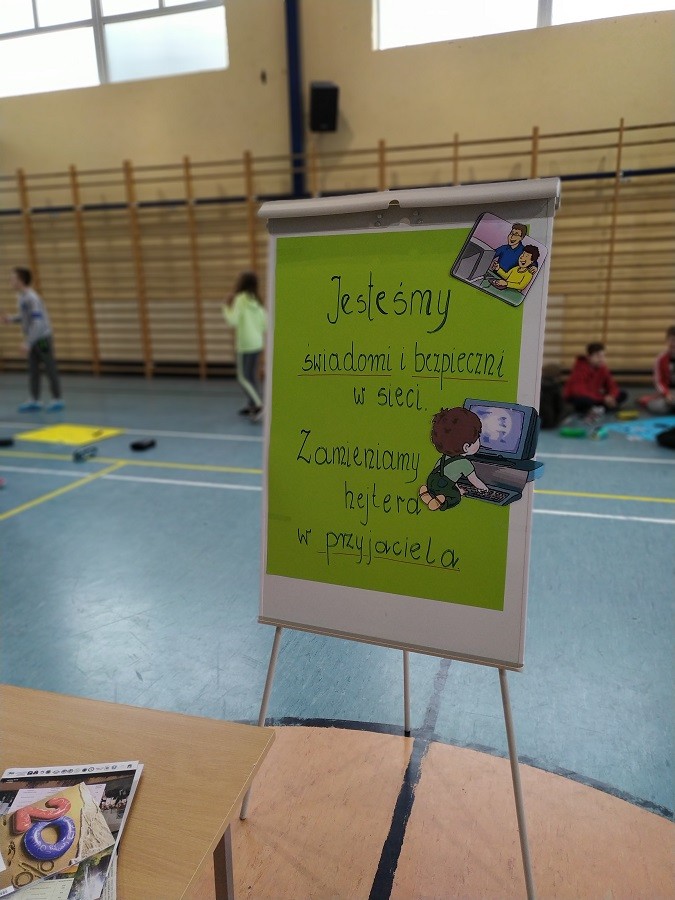 Wczoraj funkcjonariuszka z nowodworskiej Policji spotkała się z uczniami szkoły w Kmiecinie, aby porozmawiać o hejcie w sieci. Spotkanie odbyło się pod hasłem „Zamieniamy hejtera na przyjaciela". Po prezentacji i rozmowie wszyscy udali się na salę gimnastyczną, gdzie odbyły się warsztaty z pedagog szkolną Dagmarą Komoszyńską. Na zakończenie uczniowie mieli za zadanie stworzenie plakatu związanego z hasłem spotkania.