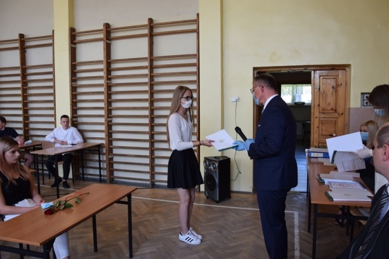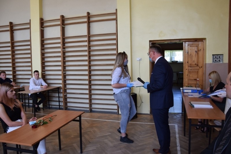 Z zachowaniem środków bezpieczeństwa tegoroczni absolwenci odebrali świadectwa ukończenia szkoły z rąk pani dyrektor Wioletty Przyborowskiej. Pani dyrektor przy wręczaniu świadectw towarzyszyli wychowawcy klas pani Ewa Pichola oraz pan Marcin Głowacki. Wszystkim absolwentom życzymy powadzenia podczas egzaminów zawodowych.