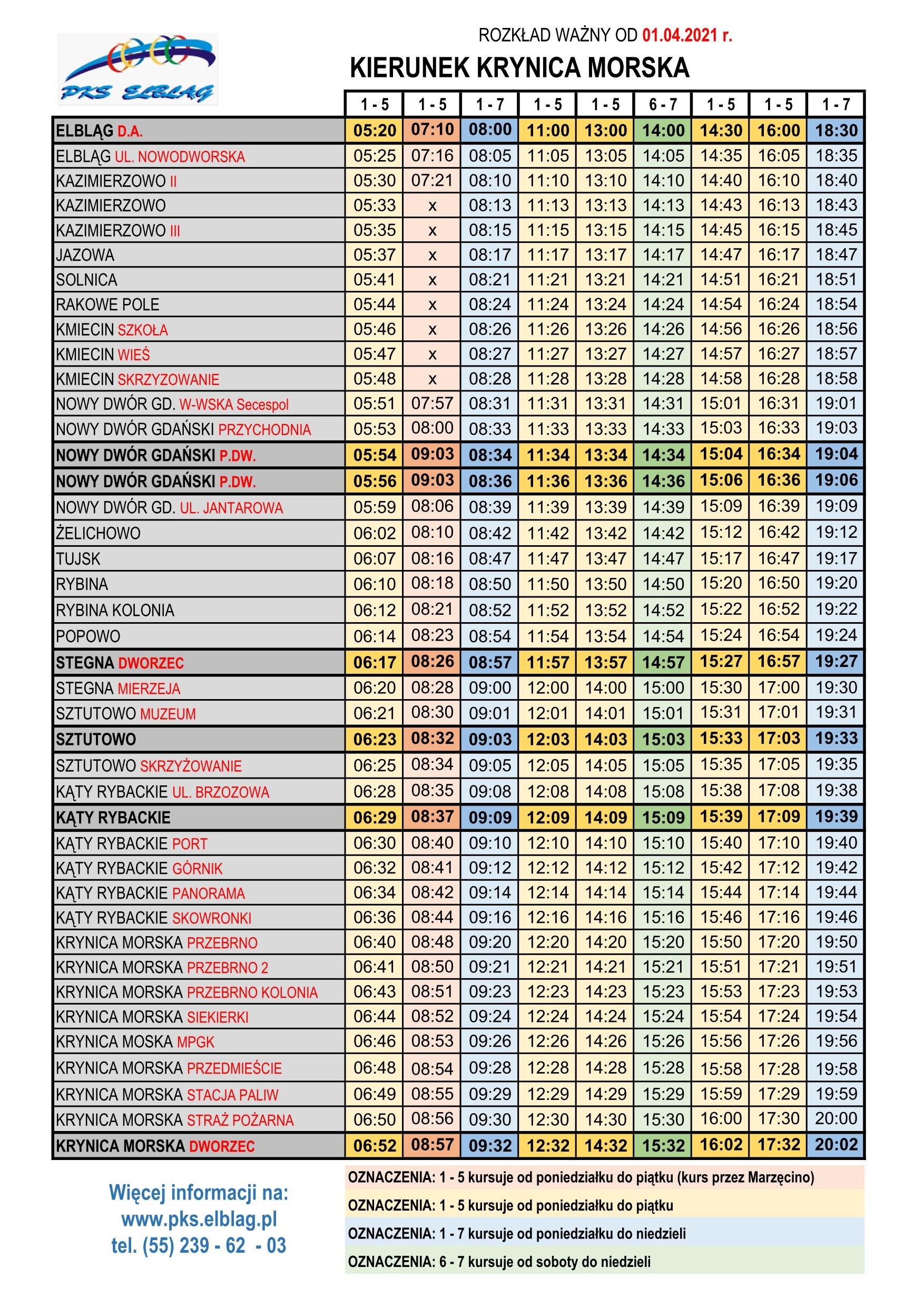 Poniżej obowiązujący od dnia 01.04.2021 r. (czwartek) rozkład jazdy na linii komunikacyjnej Elbląg - Krynica Morska - Elbląg. Prosimy również o zapoznanie się ze wszystkimi zmianami które, dostępne są na naszej stronie internetowej http://www.pks.elblag.pl oraz w punktach odprawy pasażerów.