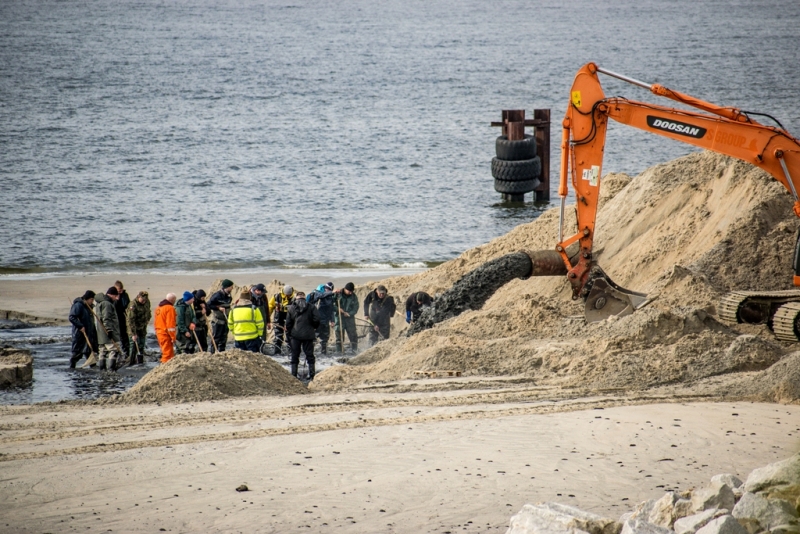Pogłębiarka Trojan dopiero rozpoczęła pracę. Informacja o rurze i bursztynie ściąga na Mierzeję coraz więcej ludzi. Rura znajduje się za falochronem na plaży jednak jeszcze na terenie budowy. Trzeba o tym pamiętać. Na teren budowy jest bezwzględny zakaz wejścia.