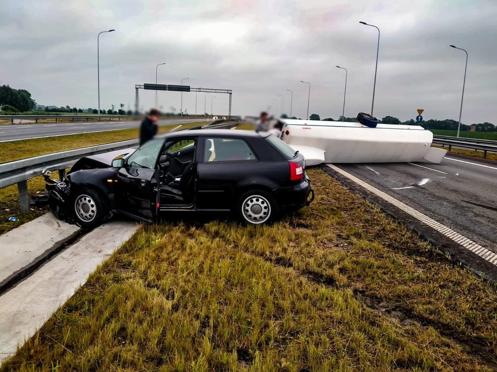 Przez około godzinę z utrudnieniami musieli się liczyć kierowcy podróżujący trasą S-7 w kierunku Elbląga. Kierowca obywatel Danii stracił panowanie nad pojazdem marki Audi A3 oraz holowaną przyczepką, na której znajdował się szybowiec, co doprowadziło do jej wywrócenia.