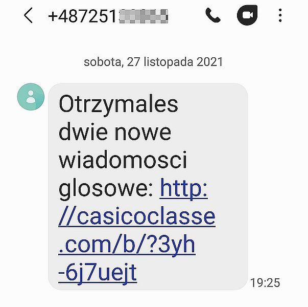 To dość nowa metoda. Przestępcy podszywają się pod operatora telekomunikacyjnego, wysyłają wiadomość sms z informacją o nagranej wiadomości głosowej. W wiadomości odczytamy, że aby ją odsłuchać, wystarczy kliknąć załączony link. Ta czynność spowoduje ściągnięcie na telefon złośliwego oprogramowania, za pomocą którego przestępcy wyprowadza pieniądze z naszego rachunku bankowego. Dodatkowo mając do niego dostęp, mogą zaciągnąć kredyty. Numer, z którego przychodzą wiadomości należy najczęściej do osoby, która nie wie o tym, że posłużyli się nim przestępcy.