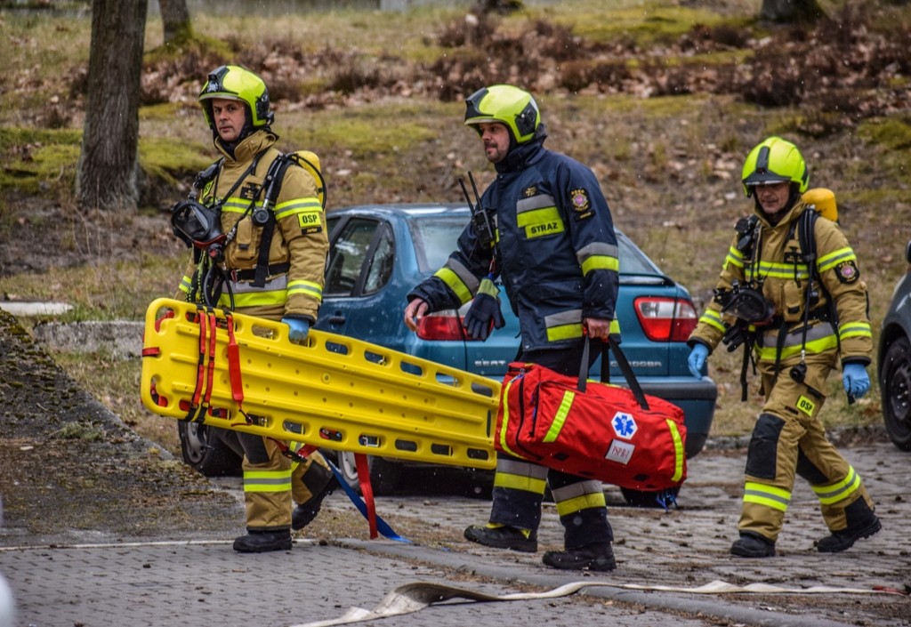 Scenariusz zakładał pożar w obiekcie, w wyniku którego dwie osoby zostały poszkodowane. Pomocy wymagały jedna osoba w pomieszczeniu gospodarczym w piwnicy, i pracownik wykonujący pracę na dachu.