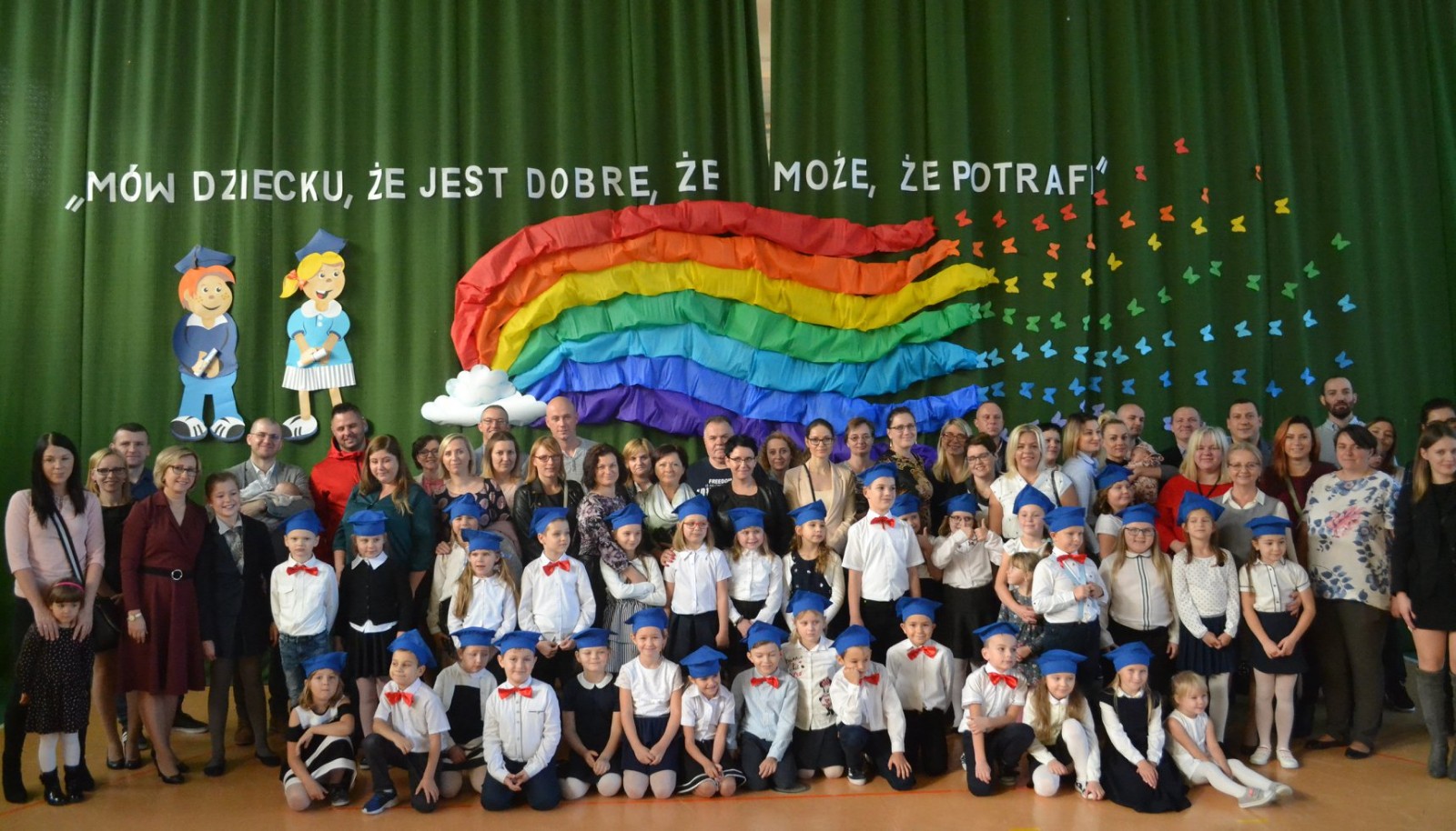 W tym dniu dzieci z klasy pierwszej zaprezentowały program artystyczny - wiersze i piosenki, następnie zostali pasowani na uczniów przez panią dyrektor, złożyli ślubowanie. Uczniowie otrzymali piękne dyplomy pamiątkowe oraz rożki szczęścia (z cukierkami) na osłodzenie początków drogi uczniowskiej.