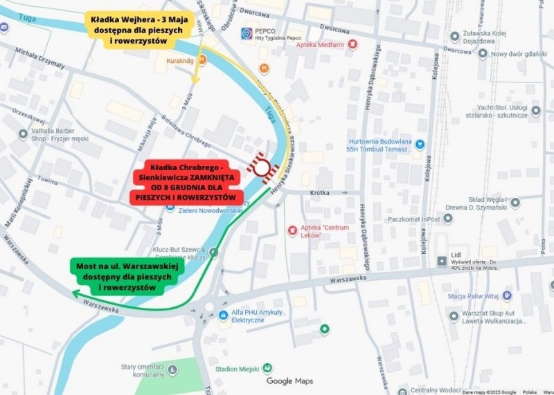W Nowym Dworze Gdańskim trwają intensywne prace związane z budową nowej kładki na trasie Chrobrego–Sienkiewicza. Od 8 grudnia dotychczasowa przeprawa nad Tugą została całkowicie zamknięta dla ruchu pieszych i rowerzystów, a na miejscu postępuje jej demontaż.
