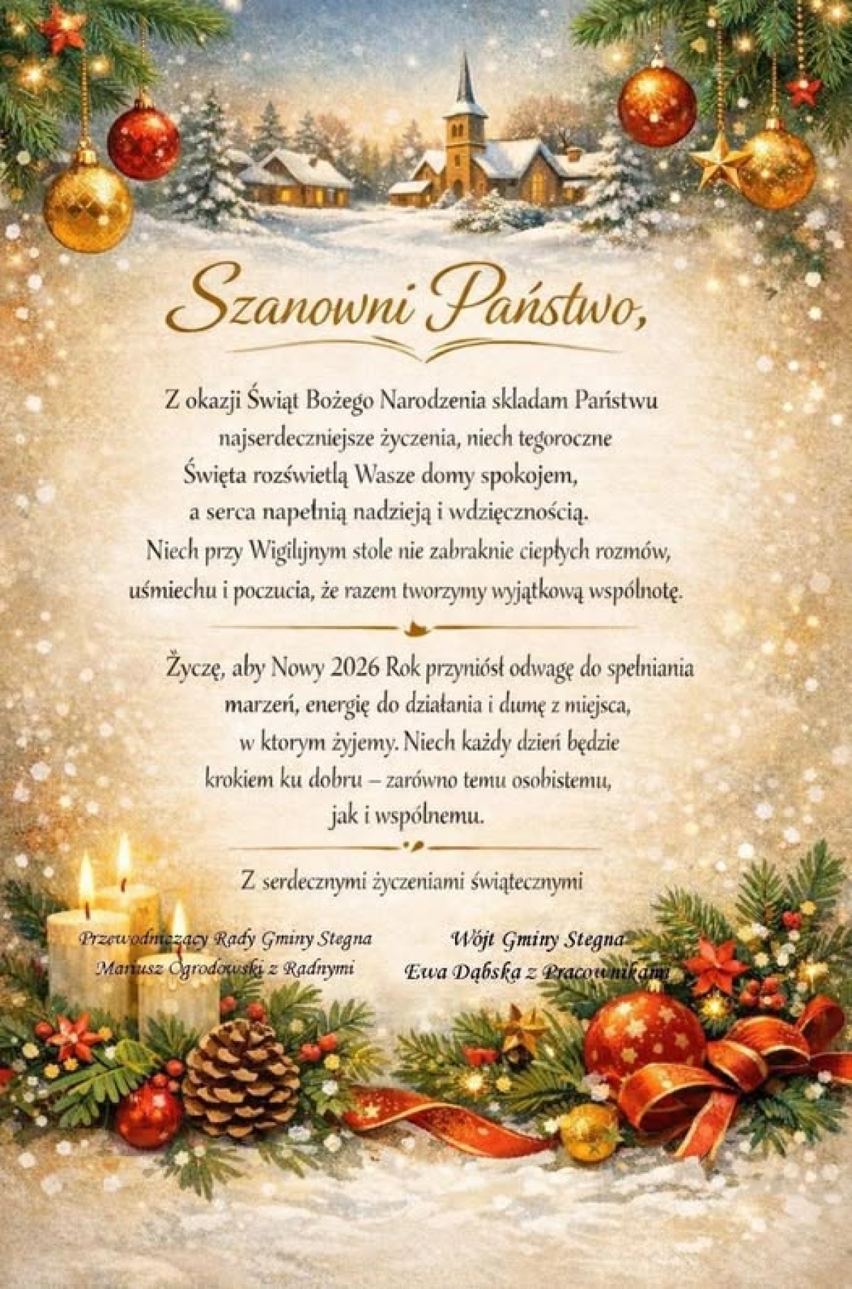Z okazji Świąt Bożego Narodzenia władze Gminy Stegna skierowały do mieszkańców wyjątkowe życzenia, pełne ciepła, nadziei i wspólnotowego ducha.