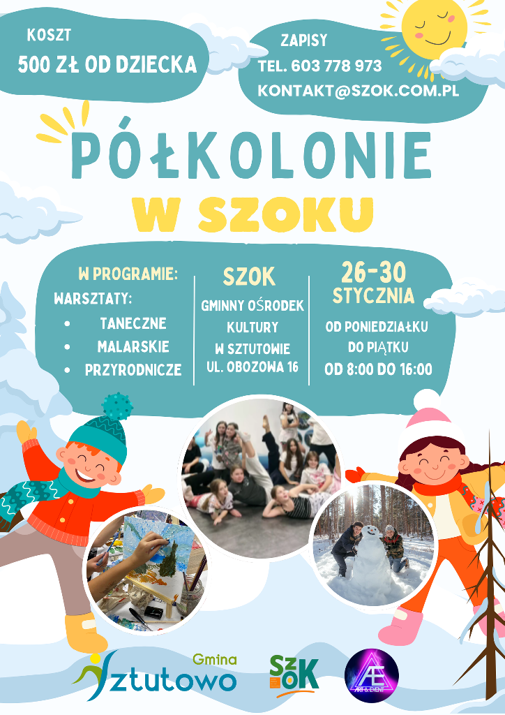 Szczególną propozycją są zimowe półkolonie organizowane przez Gminny Ośrodek Kultury w Sztutowie (SZOK), zaplanowane na drugi tydzień ferii – od 26 do 30 stycznia. Uczestnicy spędzą osiem godzin dziennie pod opieką instruktorów, korzystając z bogatego programu obejmującego warsztaty taneczne, przyrodnicze i malarskie, zajęcia ruchowe, zabawy integracyjne oraz seanse filmowe w Piwnicy Kultury. W planach jest również wyjazd na łyżwy do Stegny. Organizatorzy zapewniają trzy posiłki dziennie oraz bezpieczne warunki wypoczynku.