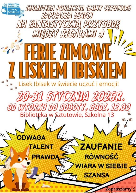 Biblioteka Publiczna Gminy Sztutowo wraz z filią w Kątach Rybackich zaprasza najmłodszych na spotkania z książką oraz zajęcia tematyczne i kreatywne w ramach cyklu „Ferie z Liskiem Ibiskiem”.